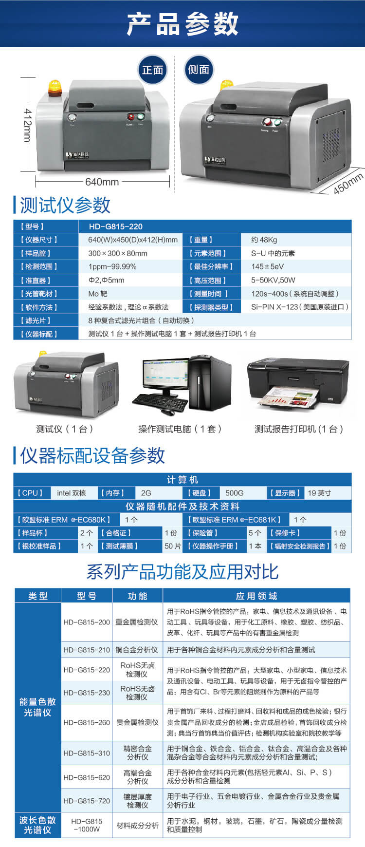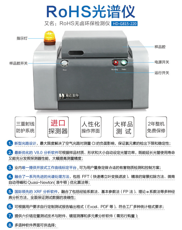 XRF-HD300 RoHS光譜儀具有三重射線防護系統;人性化操作界面;綜合應用經驗系數法、基本參數法V8.0分析軟件。元素測試范圍從Na-U。即可以管控RoHS指令的Pb、Cd、Hg、PBB和PBDE中的Br、六價鉻的Cr和無鹵指令中的Cl和Br元素。可完全滿足RoHS/WEEE/無鹵相關管控要求。
